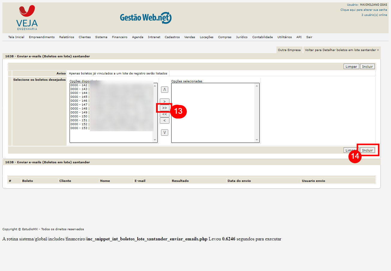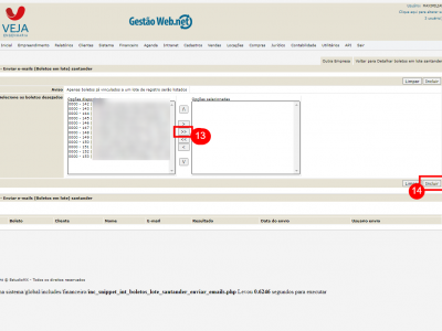 13. Clique na flechinha dupla para adicionar todos de uma só vez, uo escolha um boleto para enviar por e-mail;